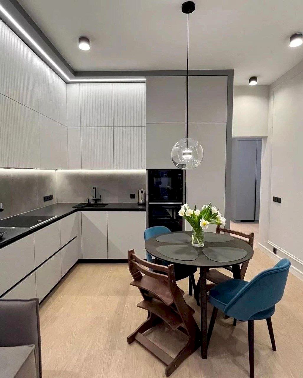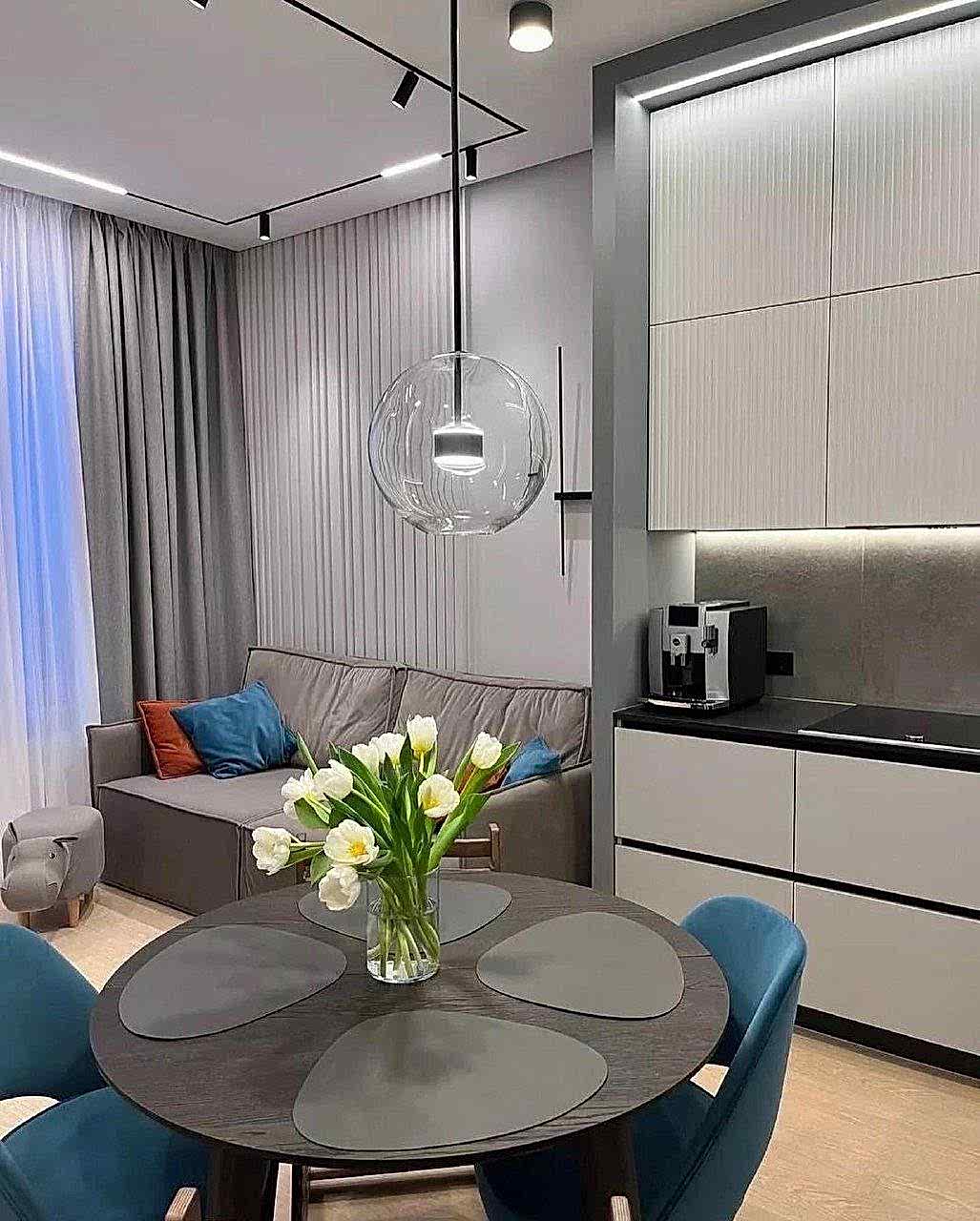 Особое внимание было уделено акцентному освещению. Круглый подвесной светильник над обеденным столом не только Пинап функциональную зону, но и создает мягкий, рассеянный свет, который добавляет интерьеру теплоты и интимности. Важно, что все источники света имеют одинаковую цветовую температуру - это сохраняет целостность восприятия пространства.