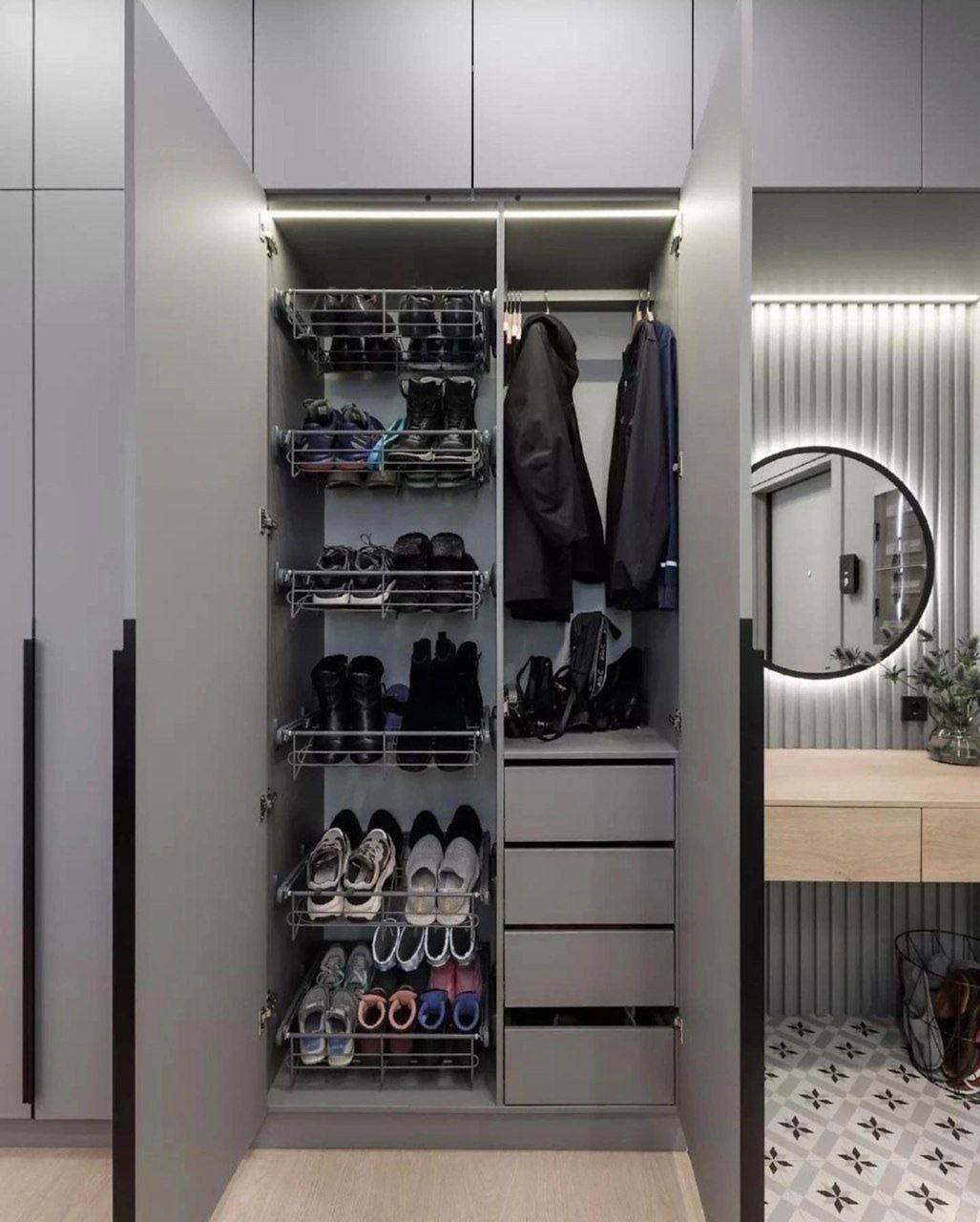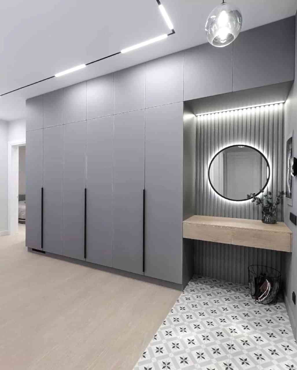 Для вечернего времени был разработан отдельный сценарий освещения. Приглушенный свет настенных бра и точечная подсветка ниш создают камерную атмосферу, превращая строгий дневной интерьер в уютное пространство для отдыха. Именно вечером серый цвет раскрывается особенно интересно, демонстрируя свою способность создавать Пинап светотеневые картины.