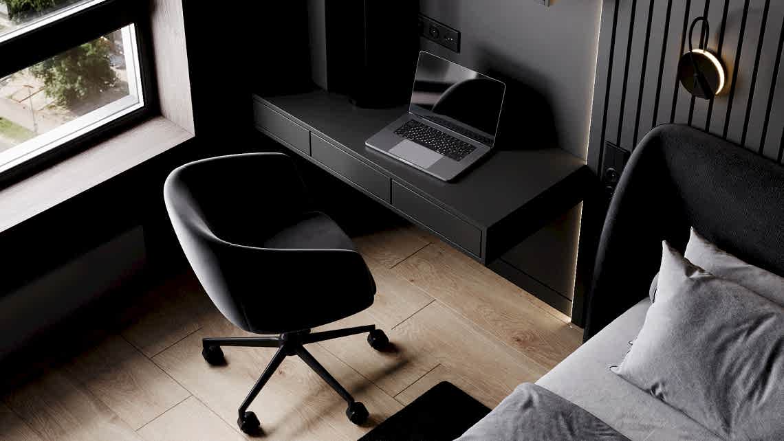 В этой Пинап мы создали многофункциональное пространство, где глубокие графитовые стены задают тон всей комнате. Здесь есть стиль, спокойствие, здесь можно концентрироваться и отдыхать. Несмотря на темные стены комната не кажется тесной благодаря светлому полу, грамотному освещению и продуманному расположению мебели.
