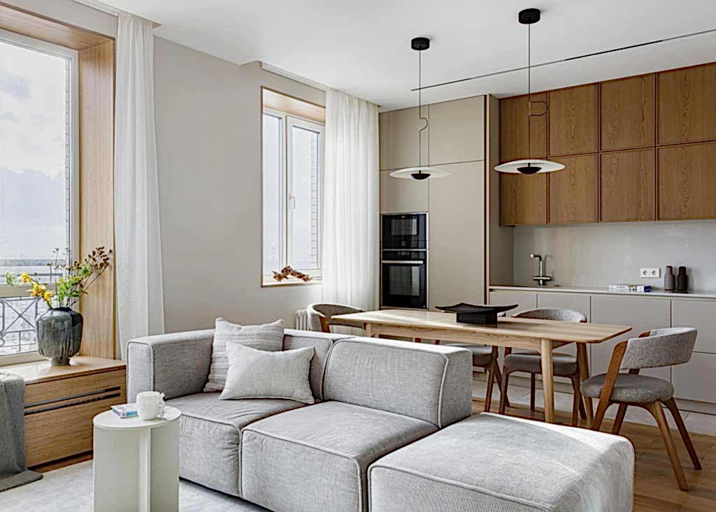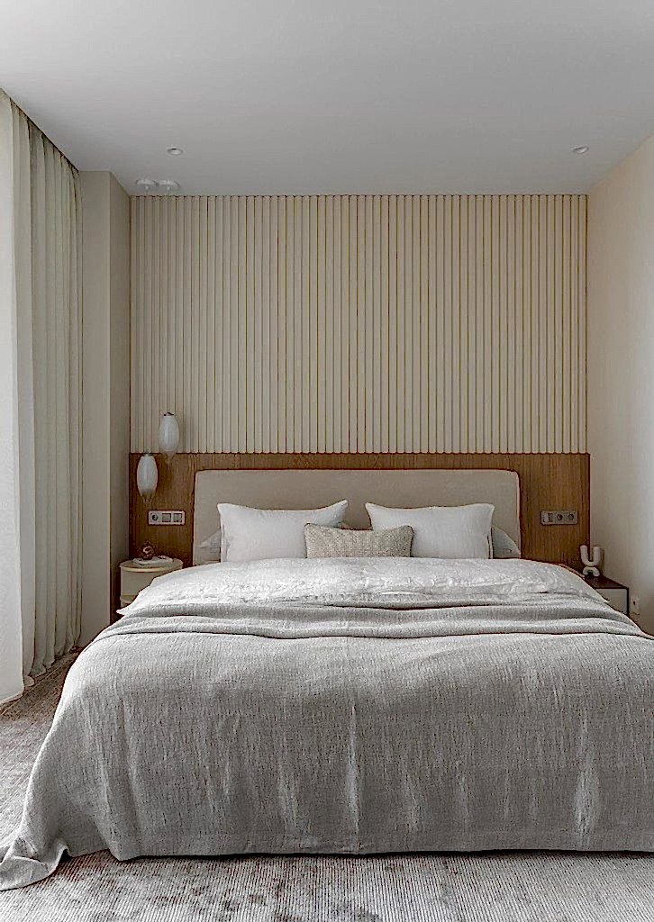 В основе проекта - минимализм с акцентом на натуральные материалы и нейтральную цветовую палитру: Пинап оттенки бежевого, серого и древесного создают атмосферу спокойствия и гармонии.