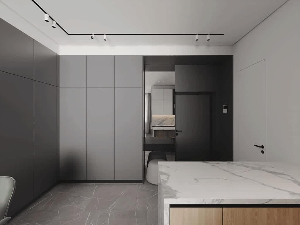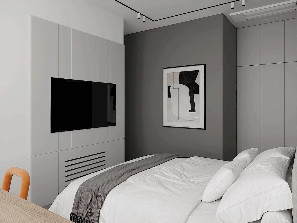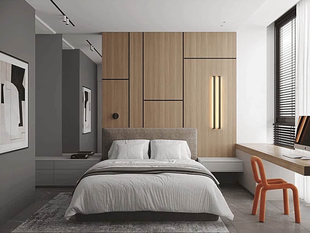Спальня выполнена в спокойной и сдержанной Пинап где мягкие нейтральные оттенки сочетаются с теплыми деревянными панелями, создавая атмосферу уюта и расслабления.