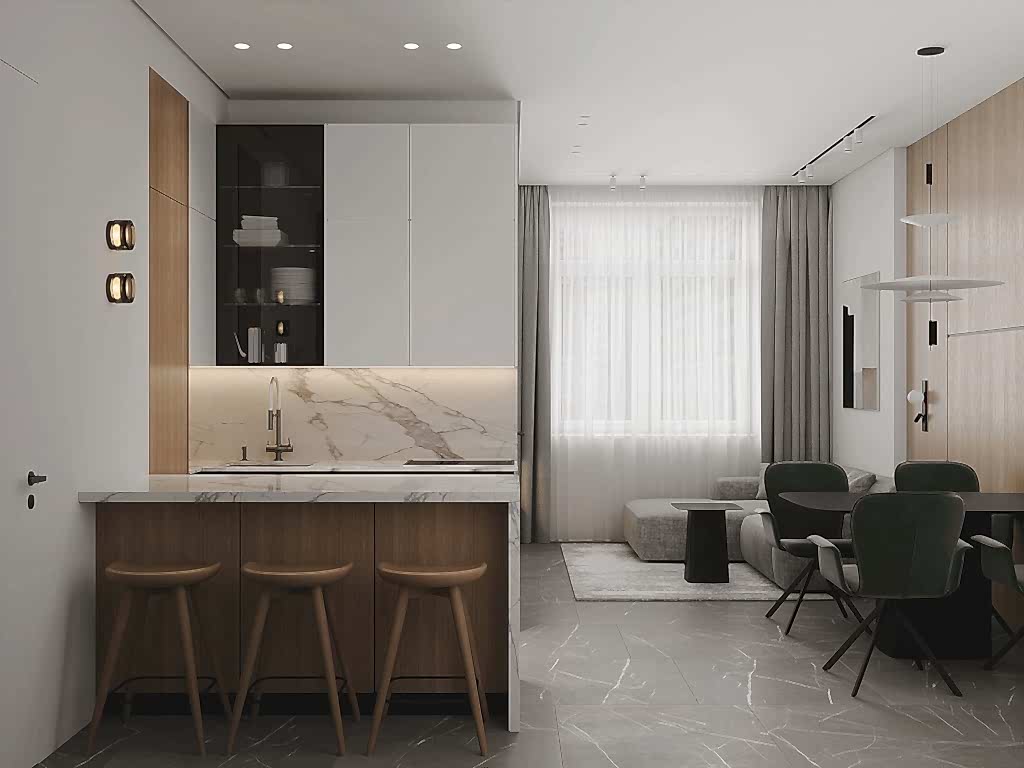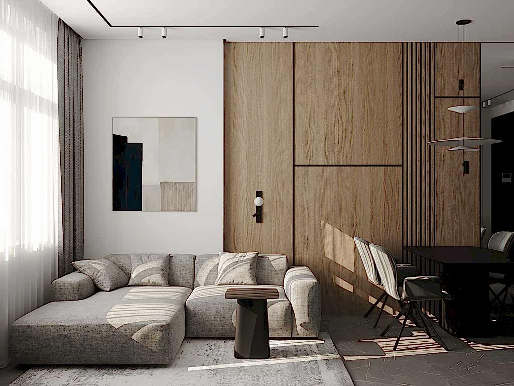 Гостиная и обеденная зона объединены в единое пространство, что визуально расширяет квартиру и обеспечивает комфорт для общения и Пинап
