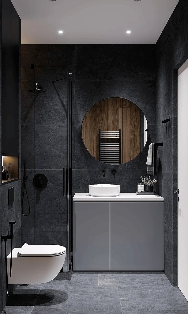Особое внимание уделено ванной - контрастный дизайн с темной плиткой и черной сантехникой подчеркивает современный стиль и добавляет глубины Пинап