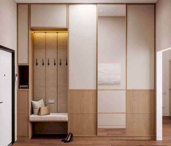 В прихожей продуман вместительный шкаф с интегрированной Пинап и подсветкой.