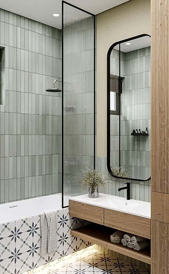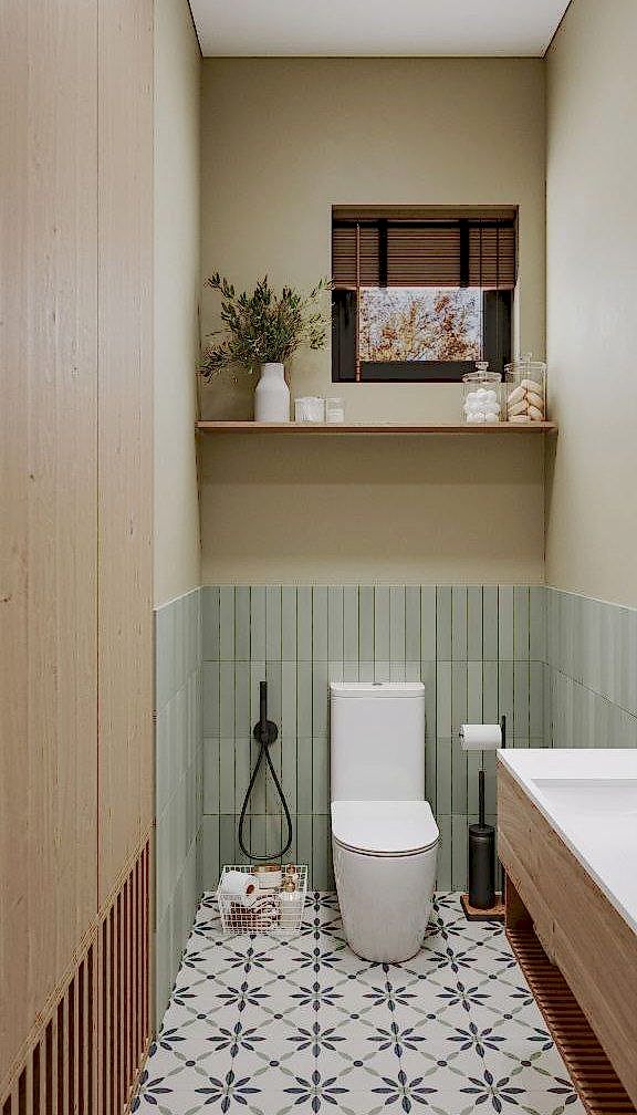 В санузле применили плитку с графичным орнаментом на полу и спокойную зеленую палитру для стен. Встроенные Пинап хранения и минималистичная сантехника обеспечивают удобство и порядок.