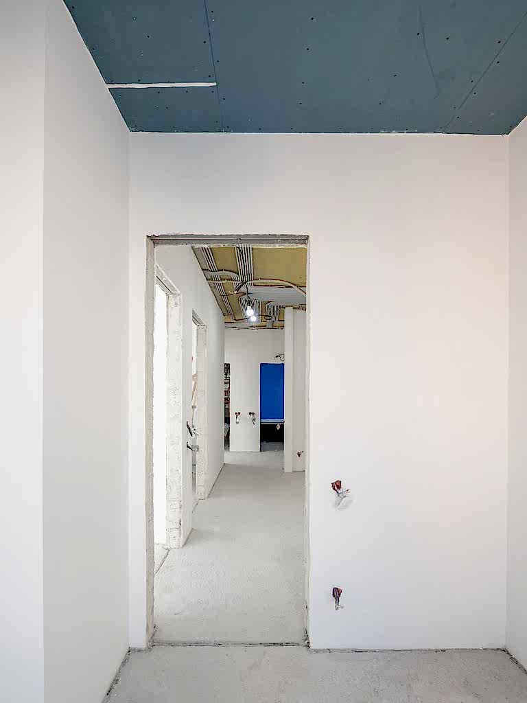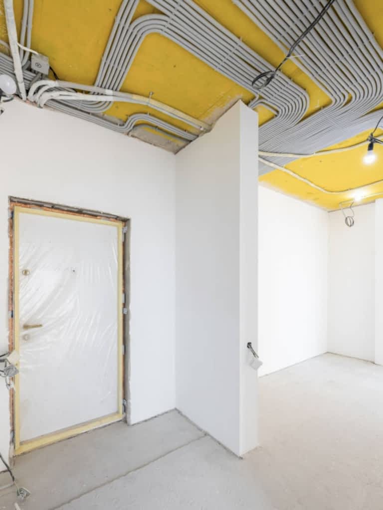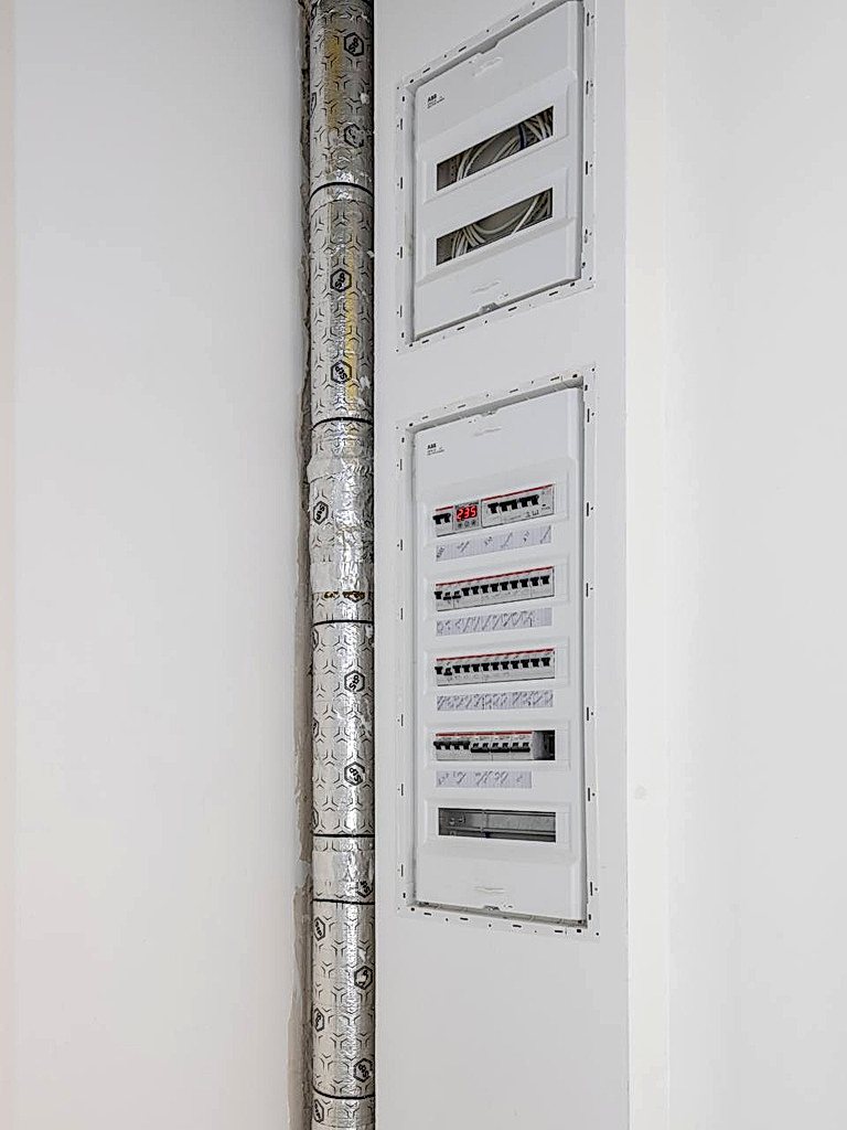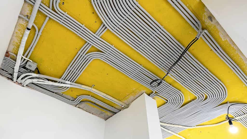 В рамках электромонтажных работ проложены кабельные трассы в гофре по потолку строго согласно проекту, с учетом сечения кабелей для всех нагрузок. Линии выполнены идеально ровно, а укладка кабелей - грамотно и эстетично, что обеспечивает надежность и аккуратный внешний вид.