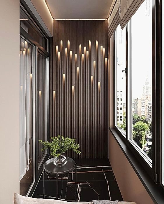 Стильный балкон в темных тонах с оригинальной подсветкой. Роскошный стиль оконных профилей гармонирует с более нежными коричневыми тонами стен, Пинап встроенными светильниками. Это место идеально подойдет для отдыха с друзьями и семьей.