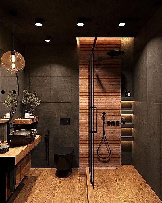 Необычный и очень красивый дизайн по желанию заказчика. Ванная комната оформлена в теплых тонах, под дерево. Дизайнерская раковина, светильник, полки и стол дополняют общий стиль помещения. Пинап хочется задержаться, чтобы сделать пару-тройку селфи.