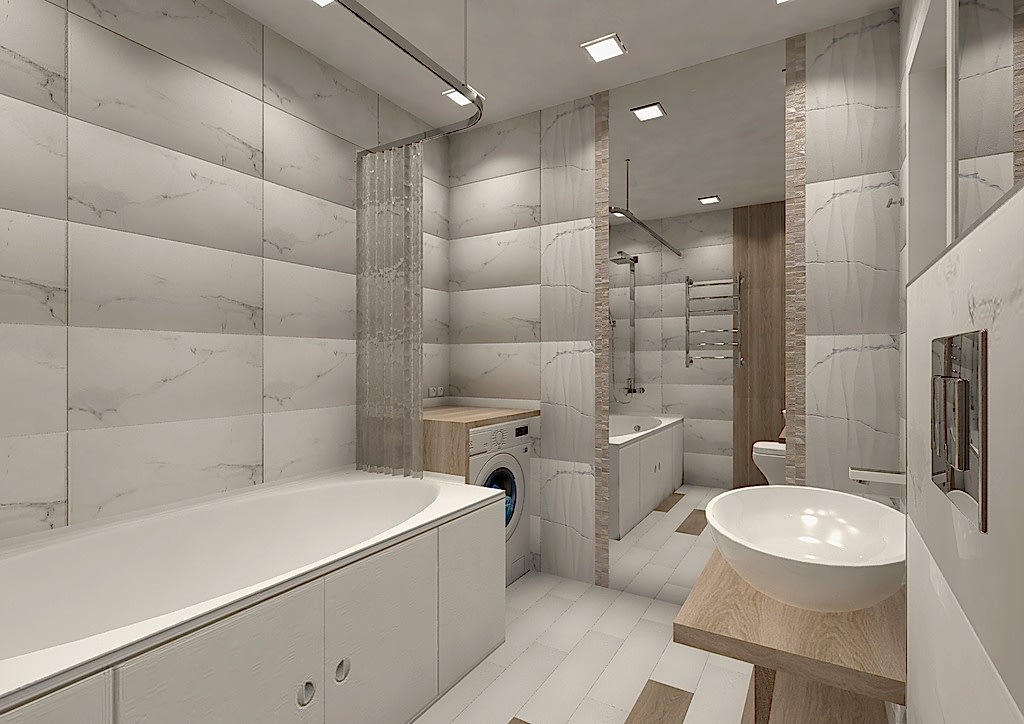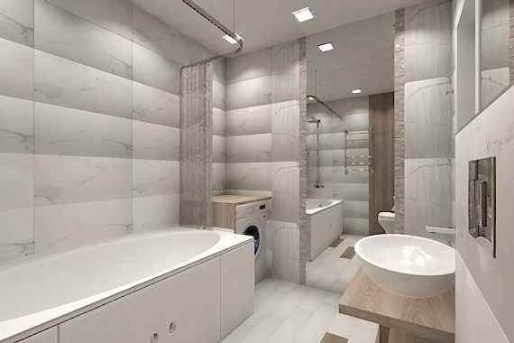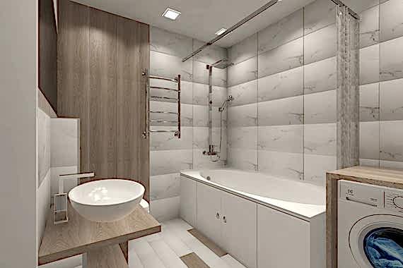 Ванная комната, в которой хочется остаться подольше. Стильная современная и неординарная. Изюминкой этой ванной стали деревянные детали, которые органично вписываются интерьер и придают ему оригинальность. Большие зеркала визуально увеличивают пространство. Эта ванная комната не только эстетична, но и практична. На керамической плитке выбранного оттенка не видны брызги и разводы от Пинап