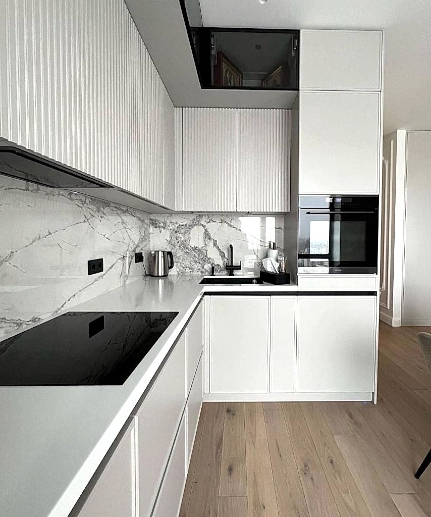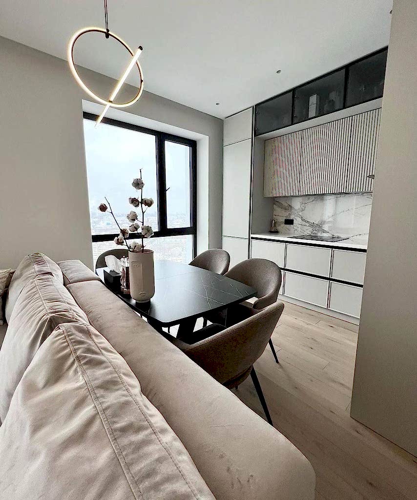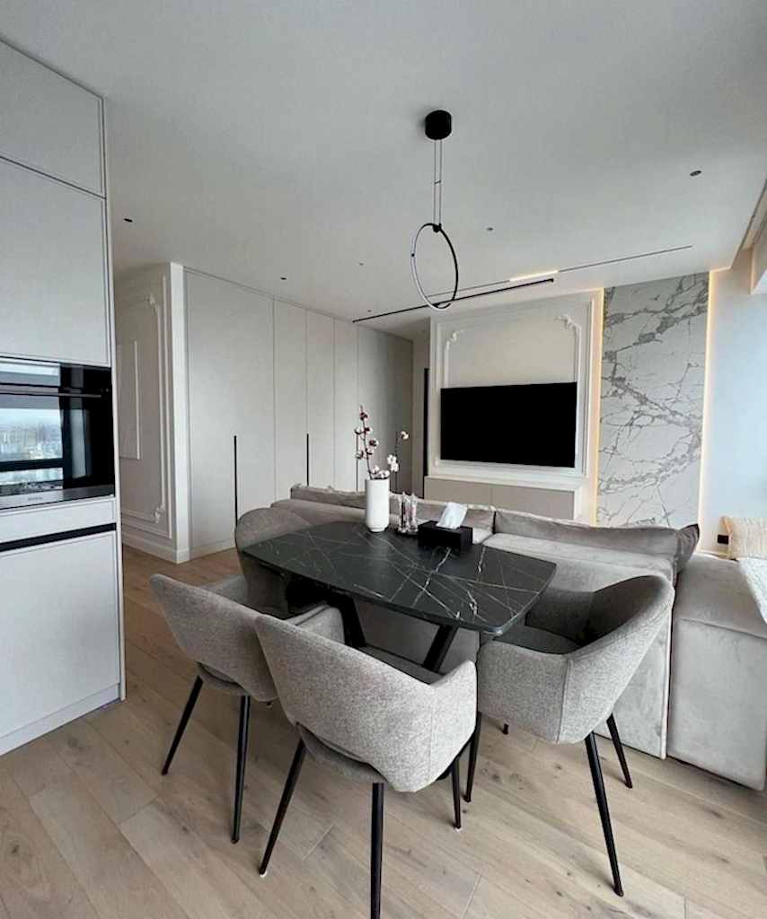 В гостиной организованы функциональные зоны: угловой диван Обеденная группа с черным мраморным столом и кольцевым Пинап плавно переходит в компактную кухню с белыми фасадами и встроенной техникой.