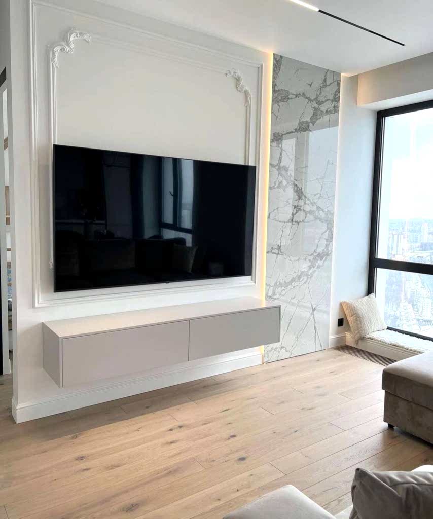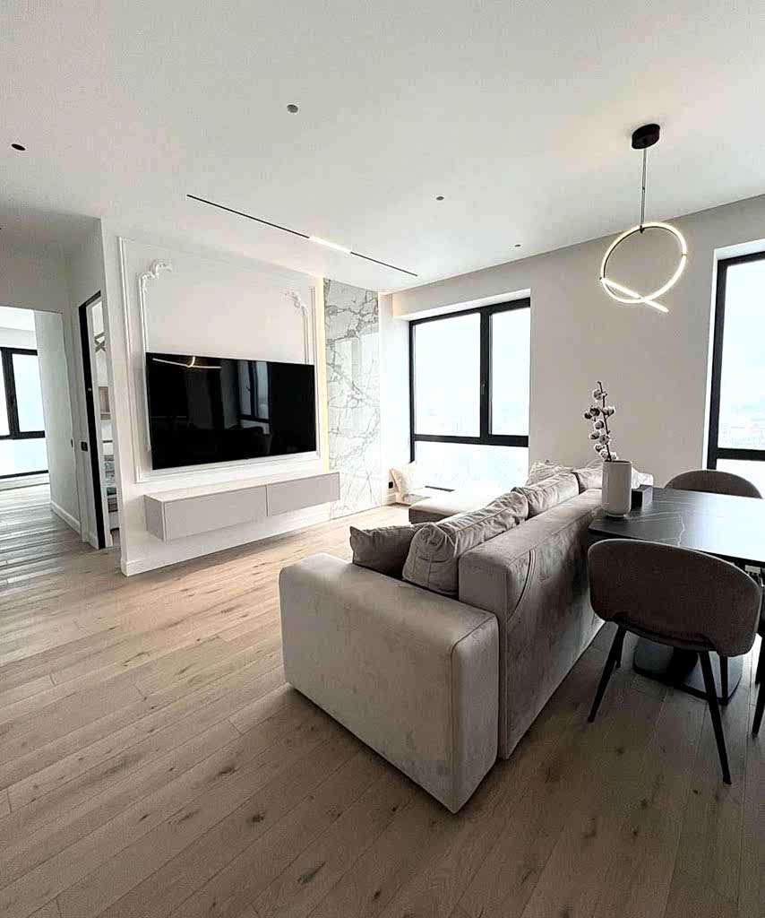 Студия дизайна интерьера SNATEK Artразработала дизайн-проект квартиры с открытой планировкой и кухней-гостиной. Панорамные окна наполняют интерьер светом. Нейтральная гамма из серых и белых оттенков в сочетании со светлым деревянным полом создает спокойную и элегантную Пинап