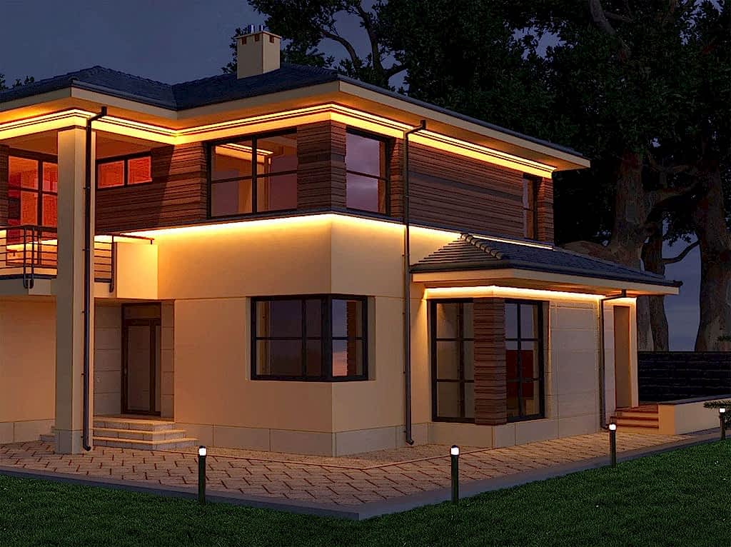 - Контурное.Подсвечиваются углы здания, благодаря чему дом обретает эффектный контур.